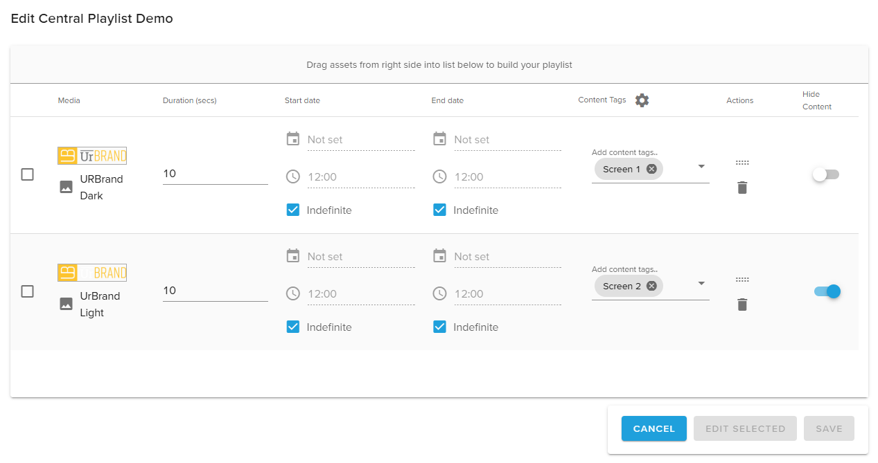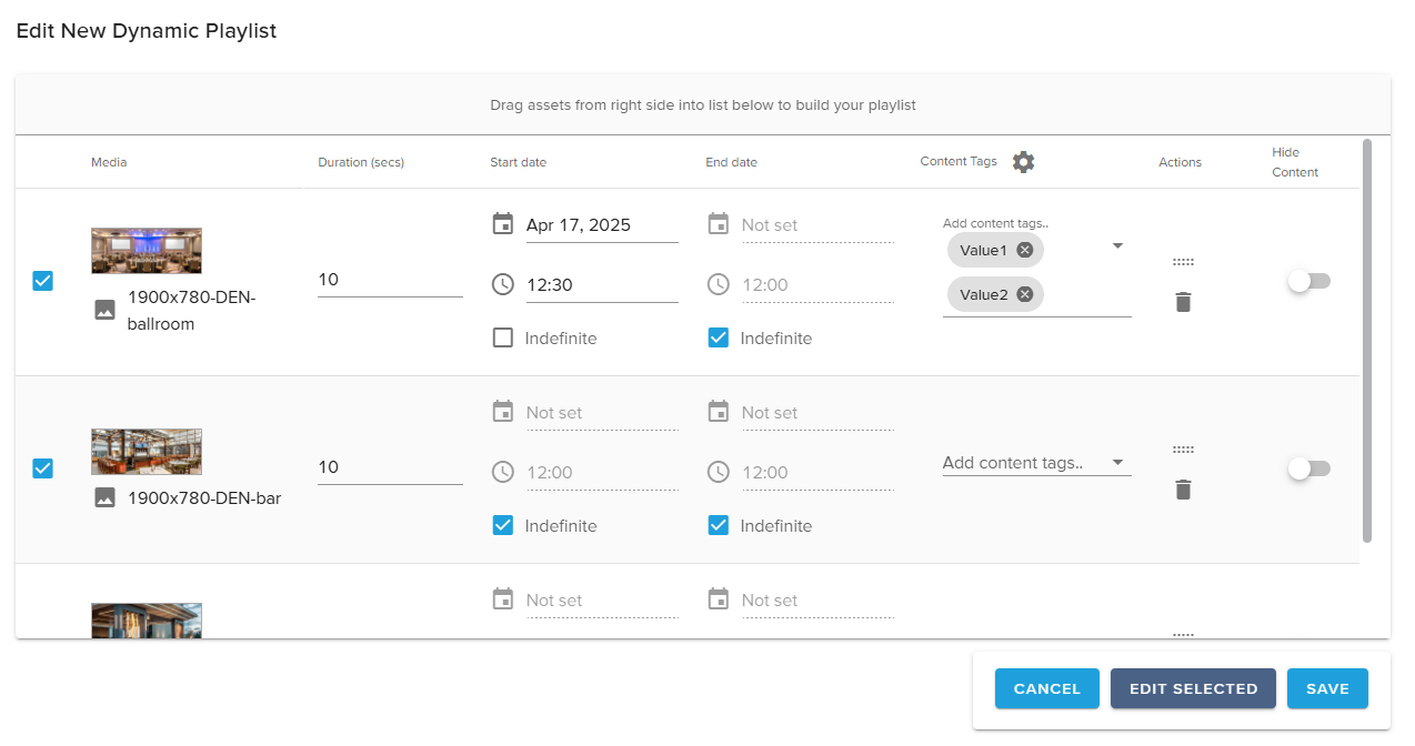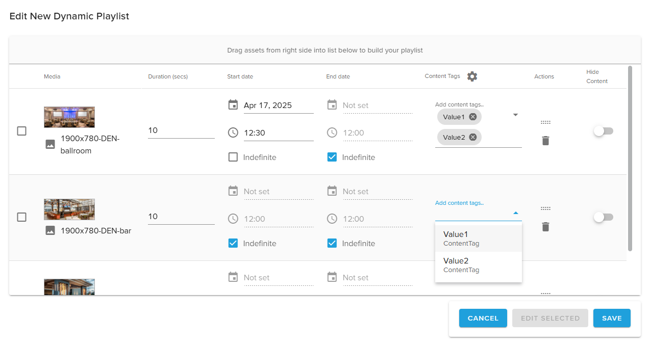 On a Dynamic Playlist, users may set Content Tags to restrict which sites or signage endpoints are eligible to display a particular piece of media.