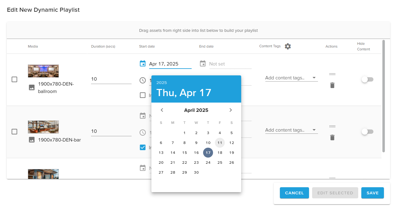 The Start date and End date columns allow a user to specify when playlist content is eligible to start and stop displaying (within the context of the schedule in which the playlist is assigned to the sign).