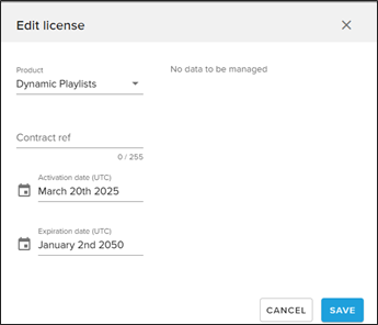 1) Dynamic Playlist license added to the site via the Reseller > Sites & Licenses module.