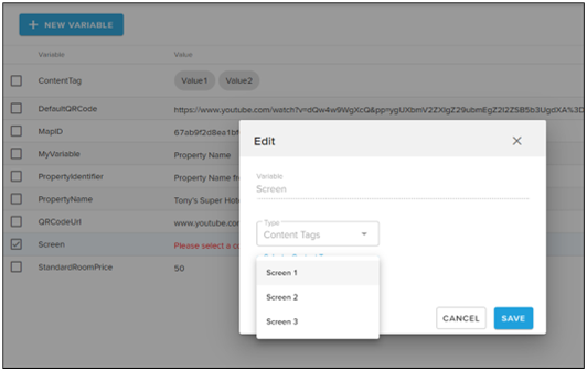 Before assigning content tags to players or playlist media, they must be created in the Variables module first.