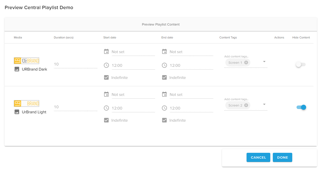 Dynamic Playlists add additional functionality to the playlist, including Date/Time scheduling and Content Tagging.