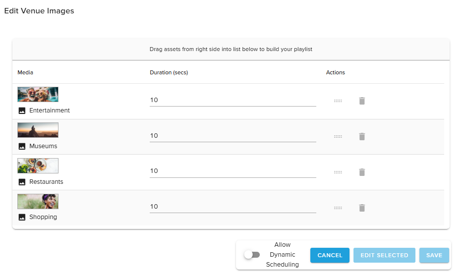 Playlists are a list of rotating image and video media that can be configured either as full screen content or embedded within a signage template using the Playlist widget.